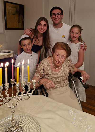 Edith Rosenbaum, a 100-year-old Holocaust survivor, with her great-grandchildren. From left to right: Rony Heumann, Carolina Heumann, Guilherme Bernstein, and Julie Heumann.